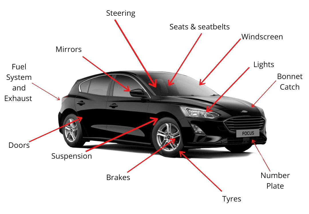 The following areas are checked during an MOT test – it is always worth checking the items you can check before your test begins, to reduce the likelihood of a failed test: